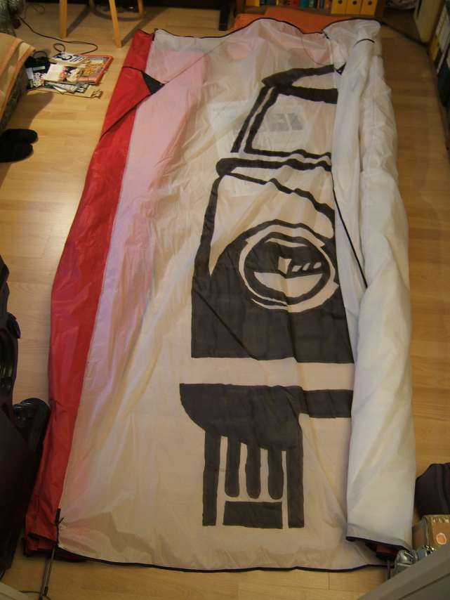 Der Double Parasled wurde nach der Vorlage unter www.fang-den-wind.de/parasled angefertigt (in der Größe des Originalplans, also mit ca. 15 mē Fläche).