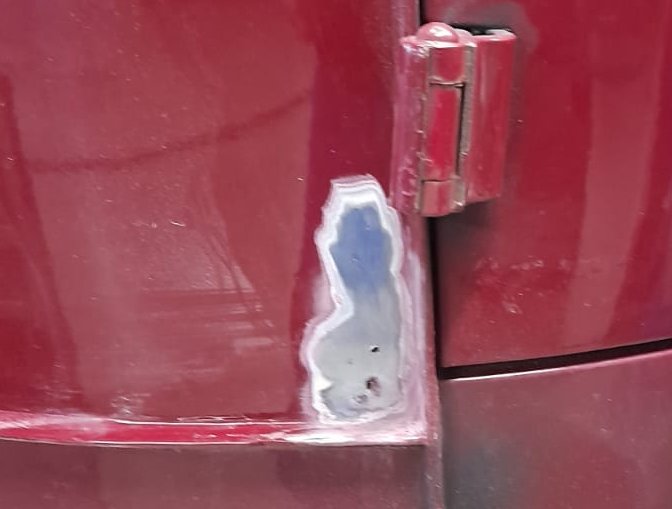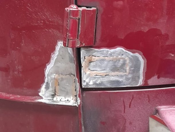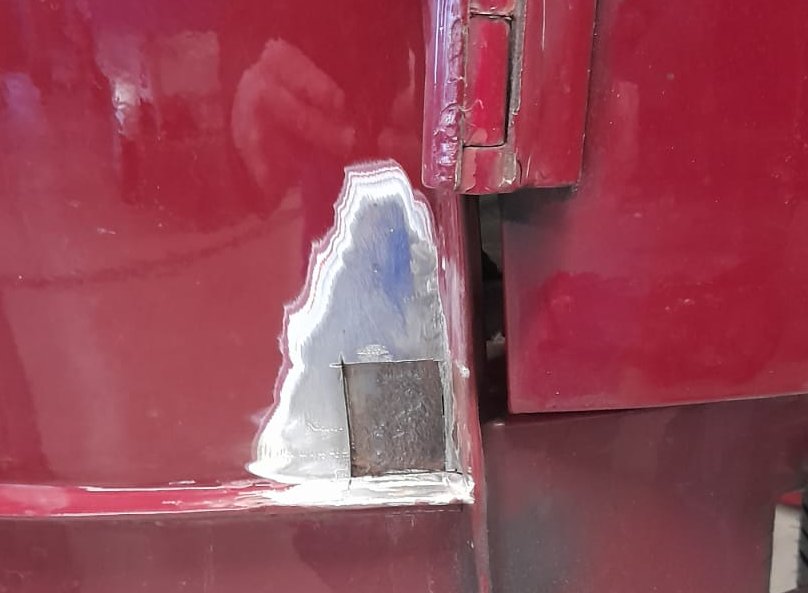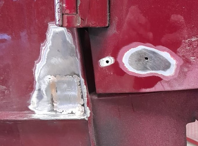 Beim Reinigen des Busses nach der Rømø-Fahrt im Herbst war mir die Blase an der fahrerseitigen A-Säule aufgefallen, und so habe ich den Bus dann zur Behebung in die bewährten Hände meiner Stamm-Werkstatt gegeben. Bei genauerem Hinsehen fielen dann auch noch kleinere Durchrostungen in der Fahrertür auf, die gleich mit behoben wurden.